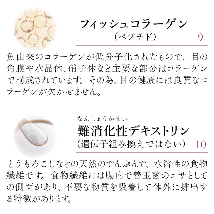 ビルベリー、ブルーベリー、黒米、ローズヒップ、赤米、紫芋、トレハロース、亜麻仁、フィッシュコラーゲン、難消化性デキストリン、カシス、カボチャ、人参、人参の葉、マリーゴールド、アイブライト