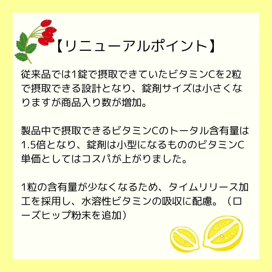 〇栄養表示:3粒(2.46g)当たり:エネルギー 10kcal タンパク質 0g 脂質 0.1g 炭水化物 2g 食塩相当量 0.002g ビタミンC 1,500mg、レモンバイオフラボノイド 150mg、ローズヒップ粉末 50mg