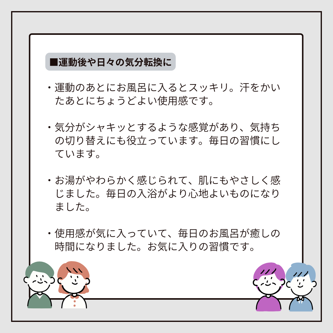ご家庭のお風呂のお湯(約180〜200リットル)に添付スプーン2杯(約50g)を入れ、よくかきまぜてご入浴ください。