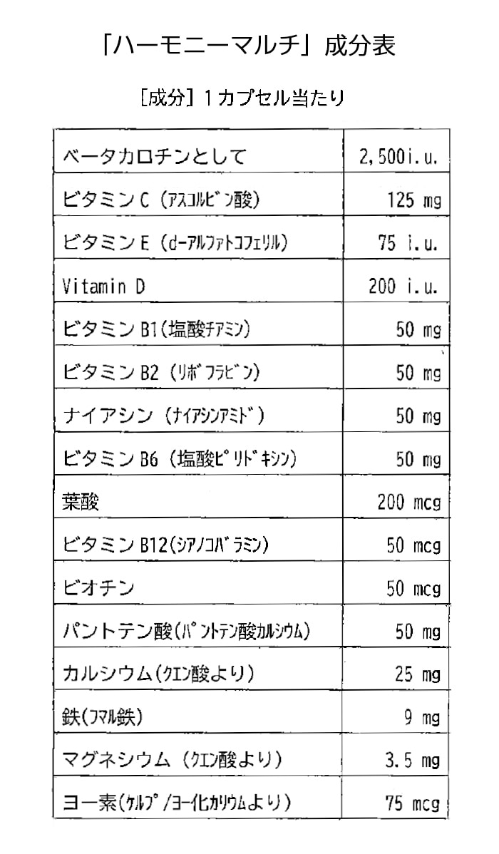 ベータカロチン、ビタミンC(アスコルビン酸)、ビタミンE(d-アルファトコフェリル)、VitaminD、ビタミンB1(塩酸チアミン)、ビタミンB2(リボフラビン)、ナイアシン(ナイアシンアミド)、ビタミンB6(塩酸ピリドキシン)、葉酸、ビタミンB12(シアノコバラミン)、ビオチンパントテン酸(パントテン酸カルシウム)、カルシウム(クエン酸より)、鉄(フマル鉄)、マグネシウム(クエン酸より)、ヨー素(ケルプ/ヨー化カリウムより)、亜鉛(クエン酸より)、セレニウム(大豆)(アミノ酸キレート)、銅(グルコン酸塩より)、マンガン(クエン酸より)、クロム(アミノ酸キレート)、カリウム(クエン酸キレート/ヨー化物)、コリン(重酒石酸)、イノシトールパラアミノ安息香酸、リン(ハイドロキシアパタイト)、バイオフラボノイド(カンキツ類)、ルチン、グルタミン酸、塩酸ベタイン、ヘスペリジン(カンキツ類)