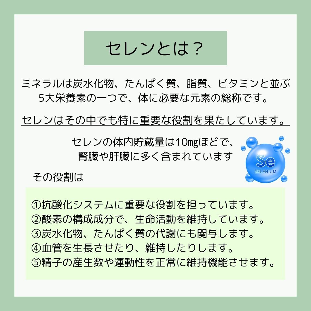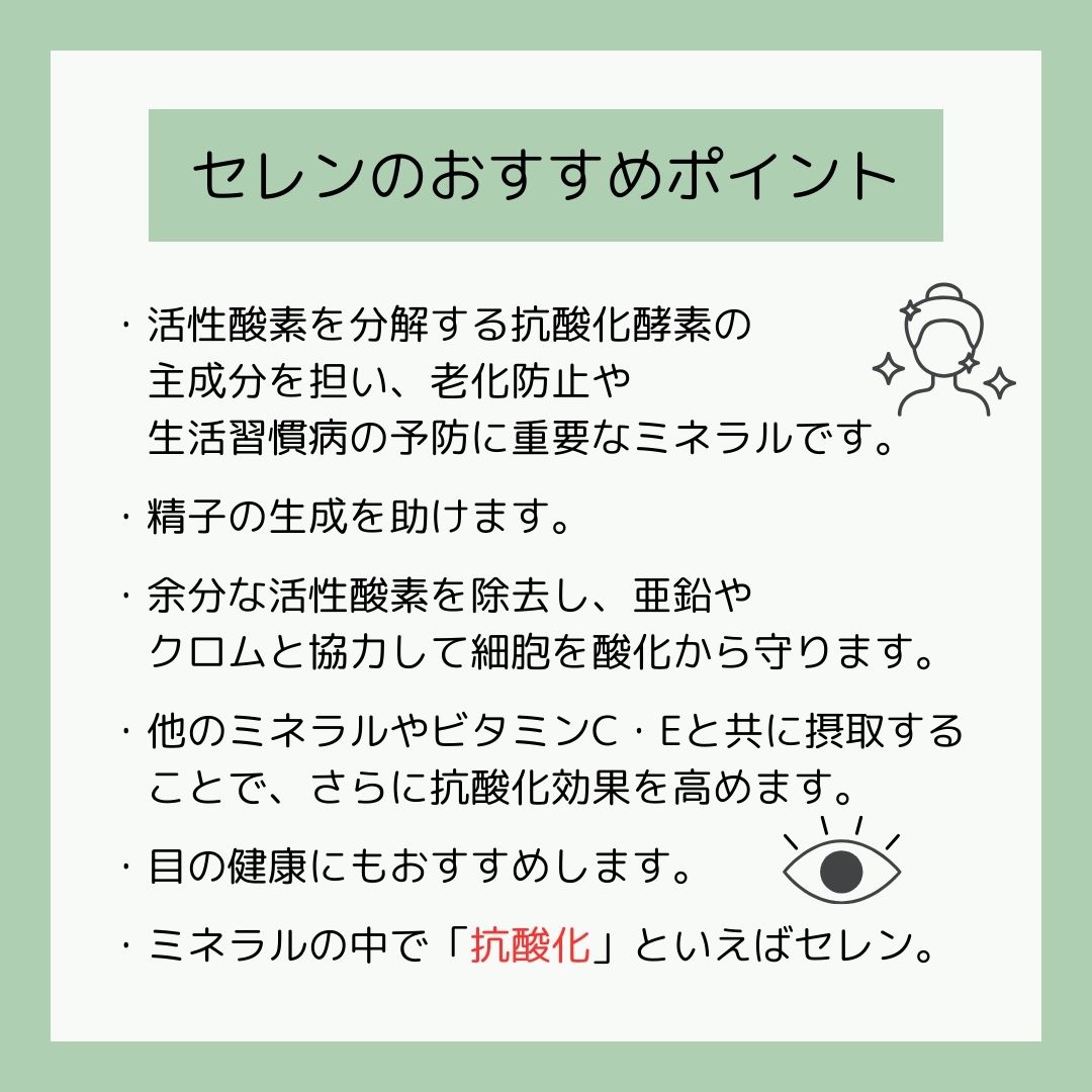 セレンは大変重要な抗酸化作用があり、亜鉛やクロムと協力して細胞を酸化から守っていると言われているミネラルです。