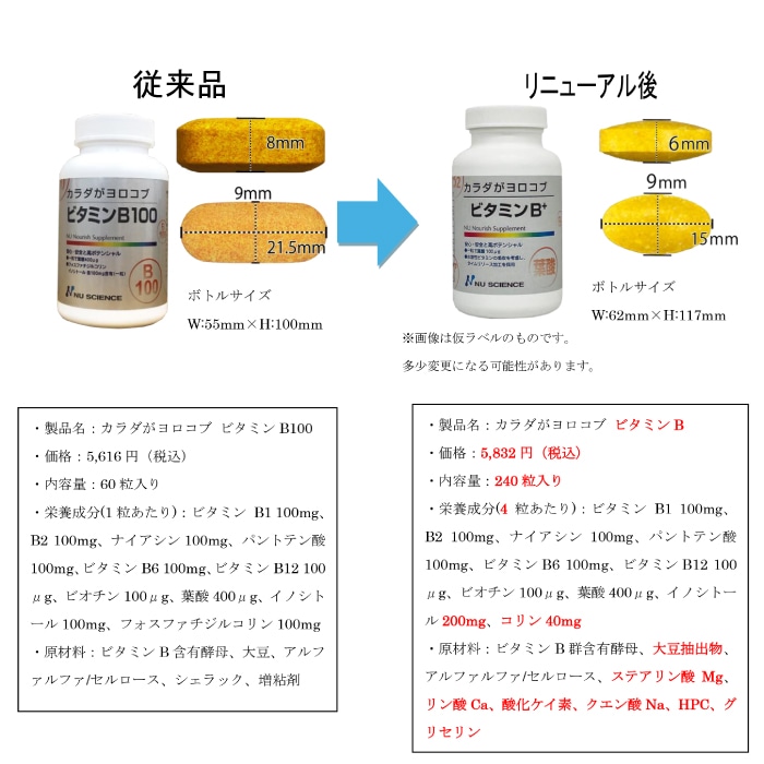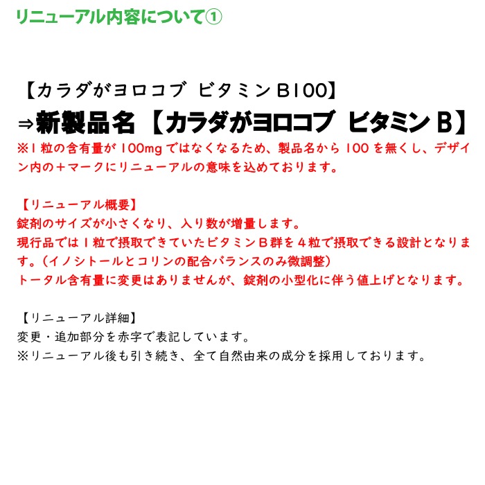 〇栄養表示:4粒(2.5g)当たり: エネルギー 8.6kcal タンパク質 0.5g 脂質 0.2g 炭水化物 1.2g 食塩相当量 0.02g ビタミンB1 100mg、ビタミンB2 100mg、ナイアシンアミド 100mg、パントテン酸 100mg、ビタミンB6 100mg、ビタミンB12 100μg、ビオチン 100μg、葉酸 400μg、イノシトール 200mg、コリン 40mg