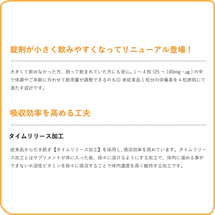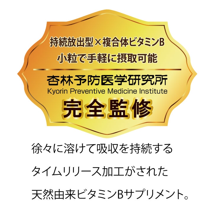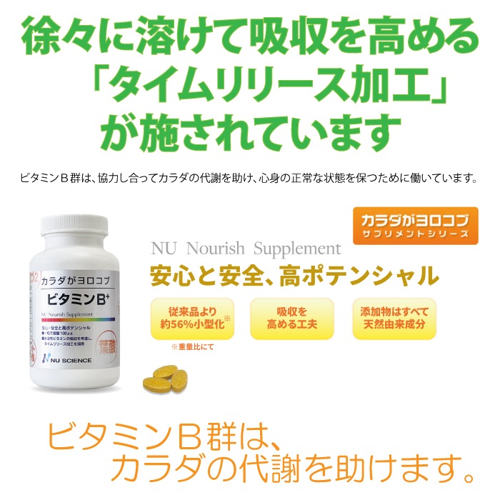 ビタミンB+はタイムリリース加工を施して吸収率を高めております。タイムリリース加工とはサプリメントが体に入った後、徐々に溶けるようにする加工で、水溶性ビタミンの吸収率を高める加工です。