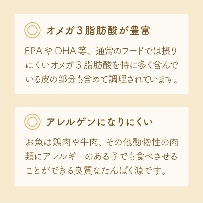 EPAやDHA等、通常のフードでは摂りにくいオメガ3脂肪酸を特に多く含んでいる皮の部分も含めて調理されています。