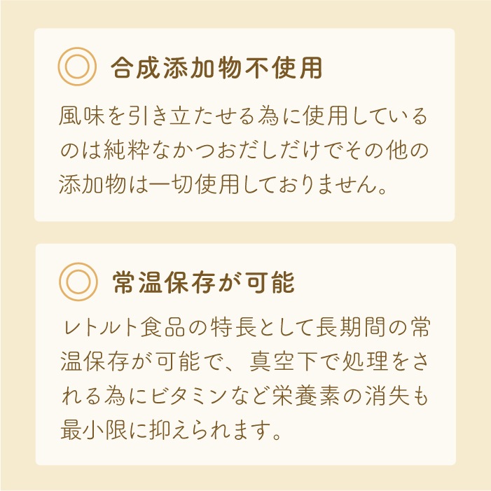 レトルト食品の特長として長期間の常温保存が可能で、真空下で処理をされる為にビタミンなど栄養素の消失も最小限に抑えられます。