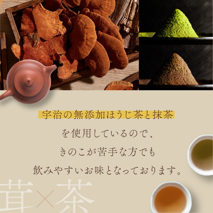 厳選された13種のきのこと無添加の宇治抹茶をブレンドし、栄養と味を両立させたプレミアムなお茶です。