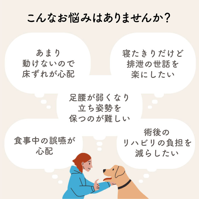 特にシニア犬や足腰が弱いワンちゃんの姿勢をサポートし、飼い主さんの負担を軽減します。