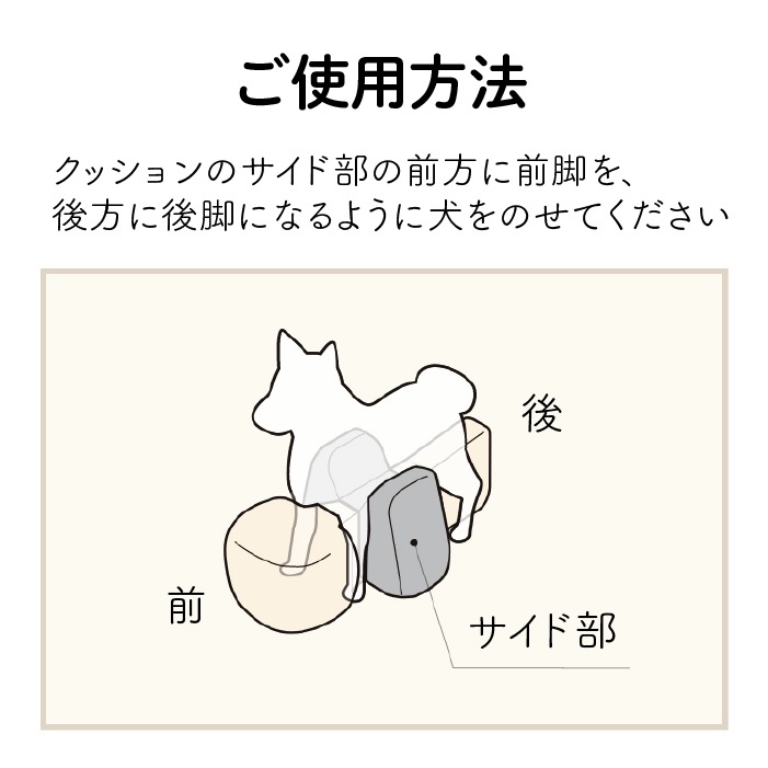 クッションのサイド部の前方に前脚を、後方に後脚になるように犬をのせてください。
