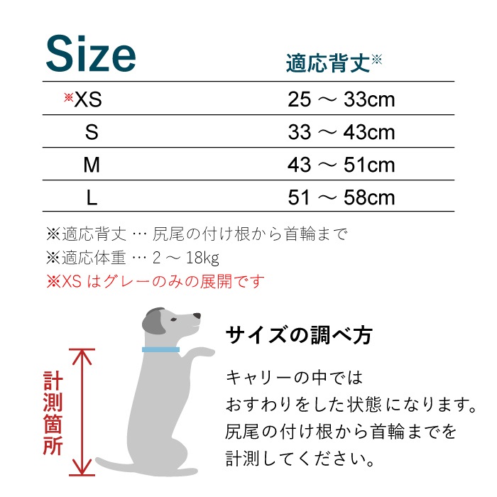 XSからLまでのサイズがあり、小型から中型のワンちゃん向けのキャリアです。ウエストサポートストラップにより、軽い運動でも使用可能です。