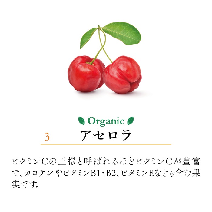 ※ローズヒップ・アセロラはオーガニック、サツマイモは合成添加物不使用の原料を使用しております。