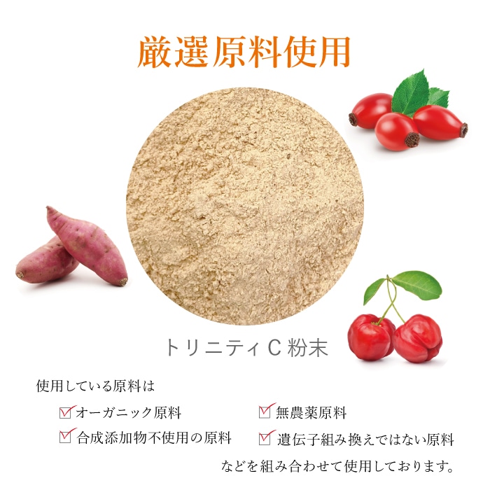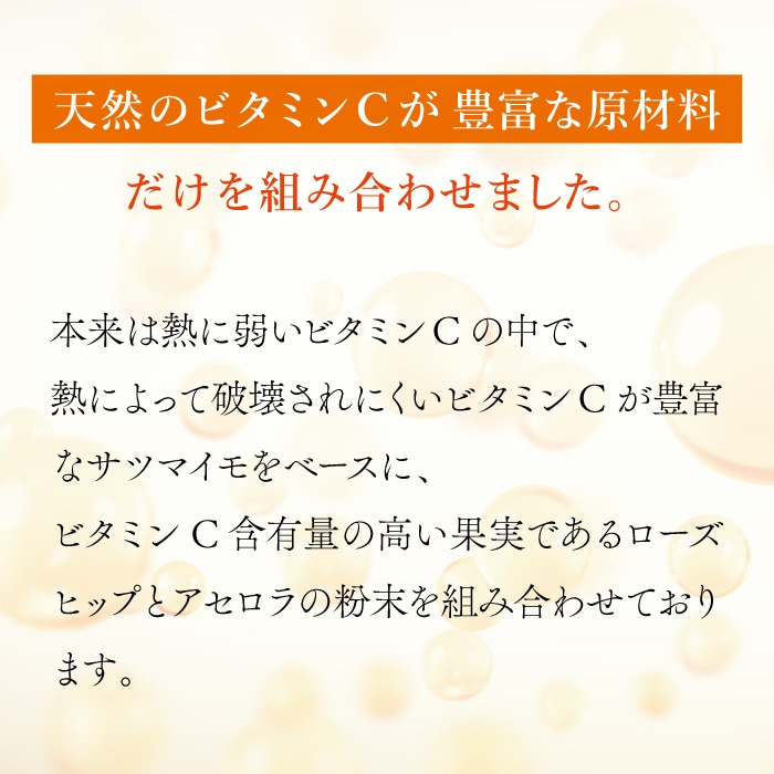 ※ローズヒップ・アセロラはオーガニック、サツマイモは合成添加物不使用の原料を使用しております。