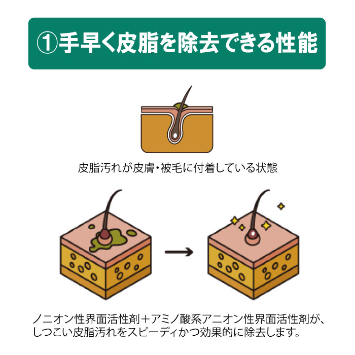 ■スピーディーに皮脂汚れを洗い落とし、メインシャンプーやリンス・トリートメントのベースを整えます。