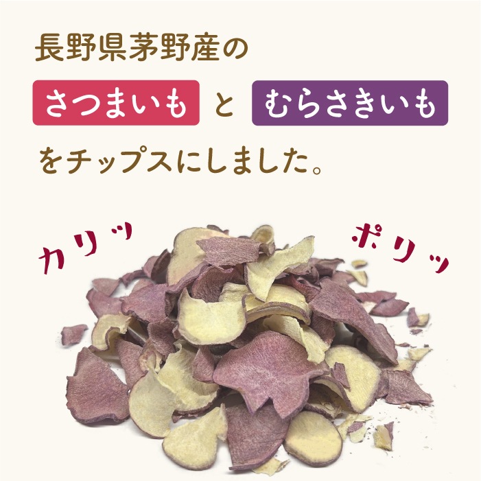 無農薬で育った長野県産のさつまいもとむらさきいもを乾燥させてチップスにしました。
