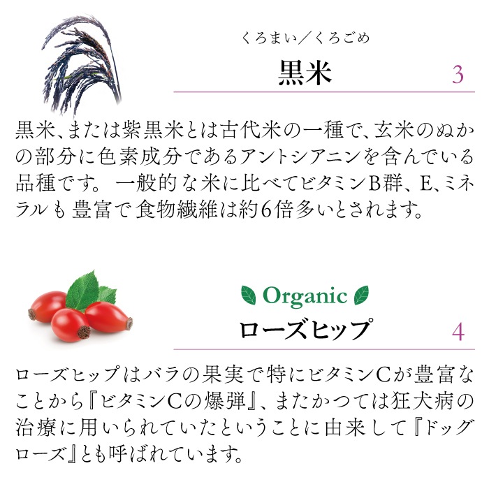 ※穀物、野菜、ハーブ類はオーガニックもしくは合成添加物不使用の原料を使用しております。