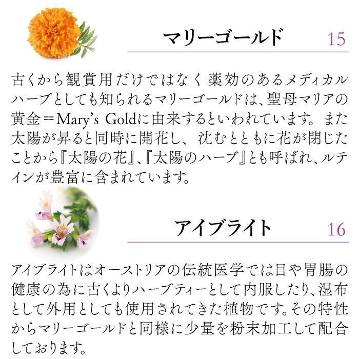 ビルベリー、ブルーベリー、黒米、ローズヒップ、赤米、紫芋、トレハロース、亜麻仁、フィッシュコラーゲン、難消化性デキストリン、カシス、カボチャ、人参、人参の葉、マリーゴールド、アイブライト
