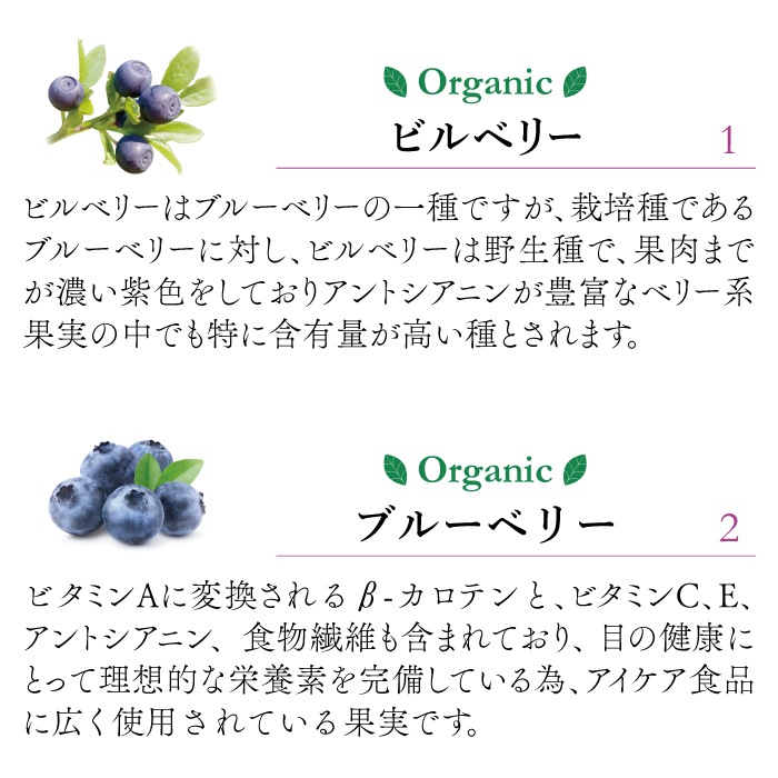 アイケアブライトネオはアントシアニンが豊富に含まれるビルベリー、ブルーベリー、カシスの3種のベリー系果実と黒米、紫芋を中心に、目の健康に重要な栄養素であるビタミンA・C・E、その他ルテインやβ-カロテンが豊富な穀物や野菜、果実、ハーブを組み合わせております。