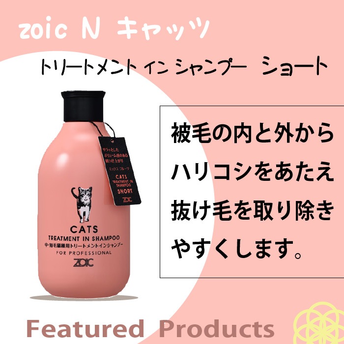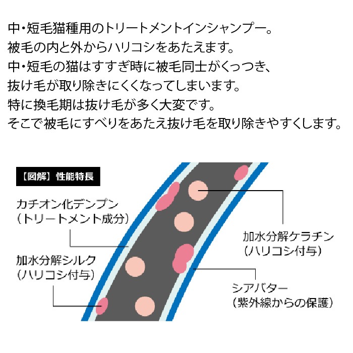 トリートメントインで被毛にうるおいをあたえ毛づやをよくし静電気の発生を抑え、適度なまとまりを実現します。