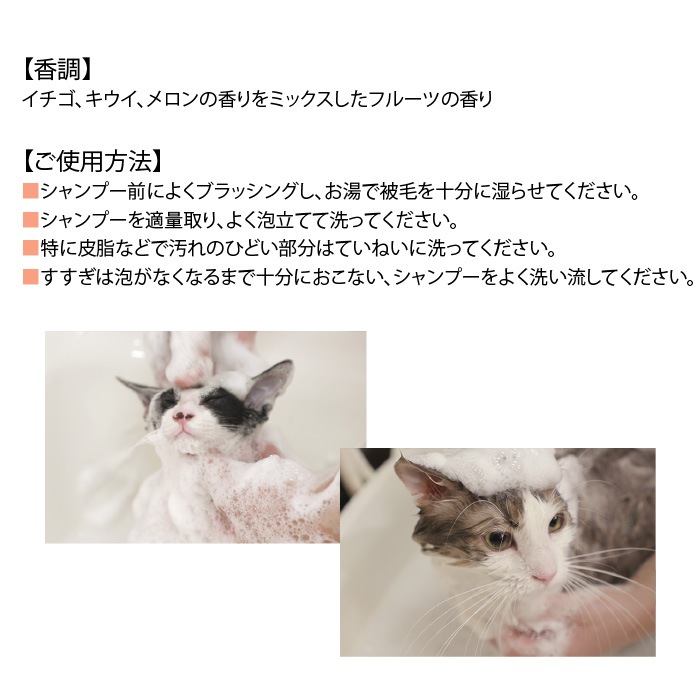1.シャンプー前によくブラッシングし、お湯で被毛を十分に湿らせてください。