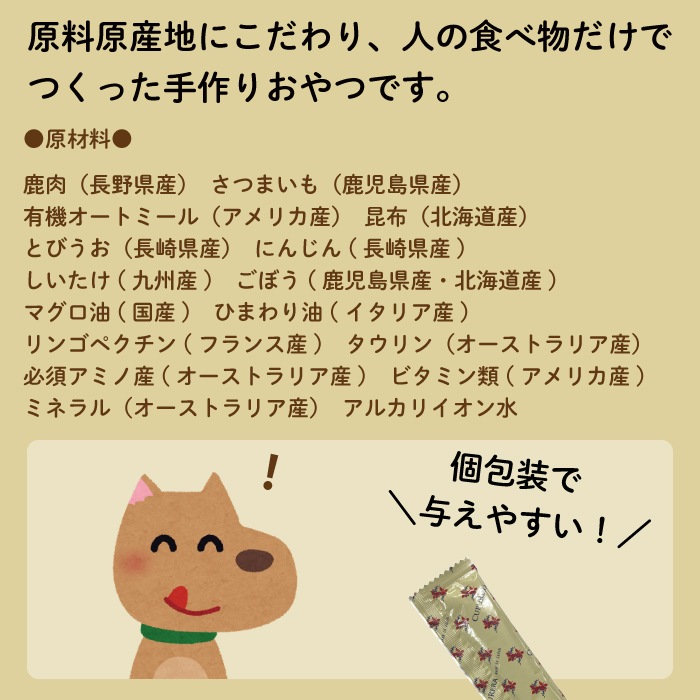 原料原産地にこだわり人の食べ物だけでつくった手作りおやつです。