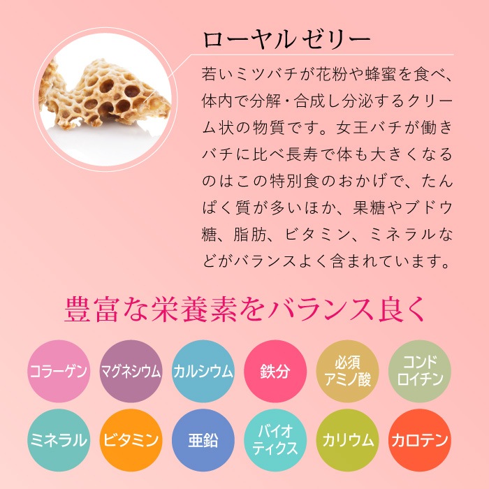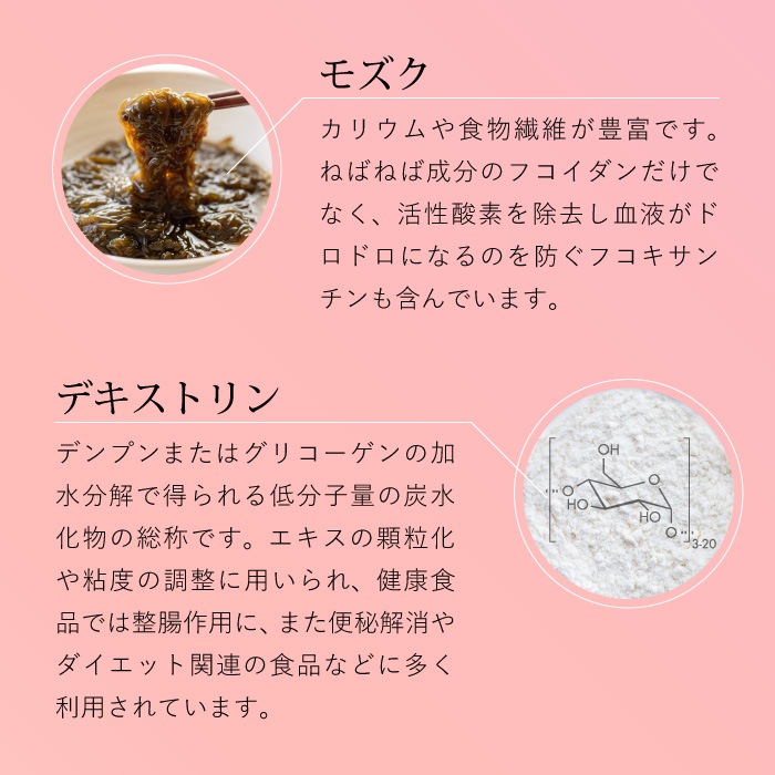 イソマル卜オリゴ糖、サツマイモ末、デキス卜リン、スッポン末、発芽玄米末、モズク抽出物(フコイダン)、環状重合乳酸(CPL)、パパイヤ抽出物、有胞子性乳酸菌(ラクリス菌・乳由来成分含む)、高麗人参末、ロ一ヤルゼリー末、微粒二酸化ケイ素