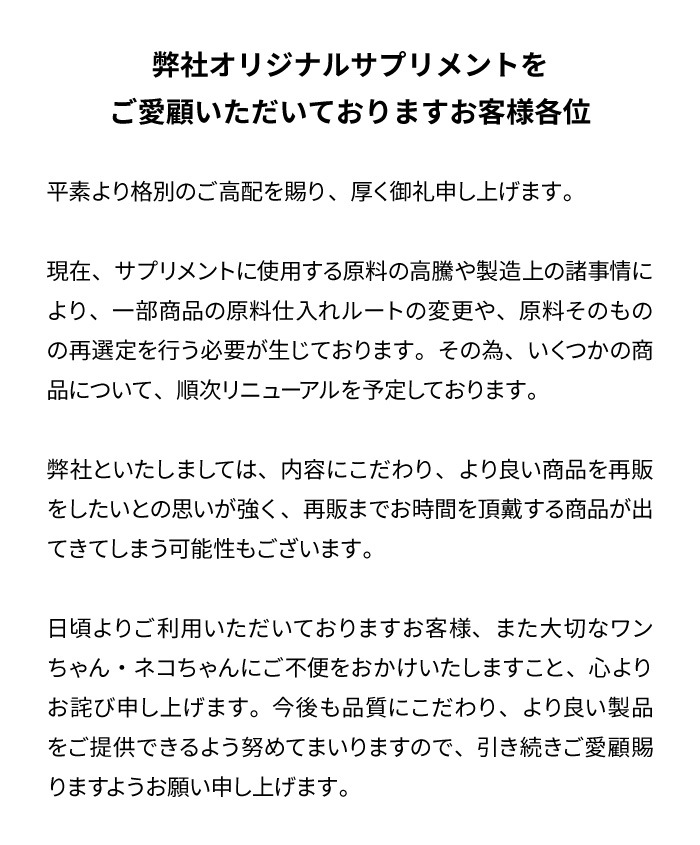 少量ずつから規定量まで徐々に増やしていただく事をおすすめします。(特に胃腸の弱い子)