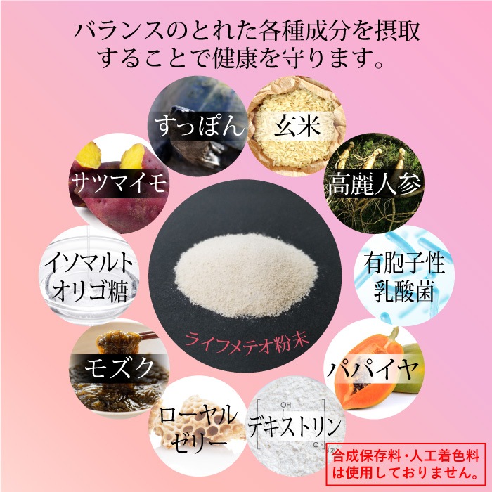 イソマル卜オリゴ糖、サツマイモ末、デキス卜リン、スッポン末、発芽玄米末、モズク抽出物(フコイダン)、環状重合乳酸(CPL)、パパイヤ抽出物、有胞子性乳酸菌(ラクリス菌・乳由来成分含む)、高麗人参末、ロ一ヤルゼリー末、微粒二酸化ケイ素