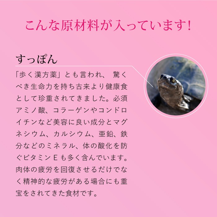 また滋養強壮、体力向上に定評があるスッポンや高麗人参、ローヤルゼリーなども加えることで断食(ファスティング)時や、病中、病後でも、無理に食事を与えて臓器を働かせず、なるべくエネルギーを使わないで、効率的に栄養素を吸収することができる商品です。