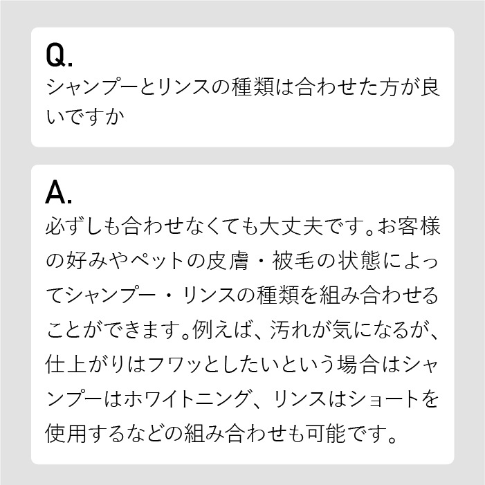 A:必ずしも合わせなくても大丈夫です。お客様の好みやペットの皮膚・被毛の状態によってシャンプー・リンスの種類を組み合わせることができます。例えば、汚れが気になるが、仕上がりはフワッとしたいという場合はシャンプーはホワイトニング、リンスはショートを使用するなどの組み合わせも可能です。