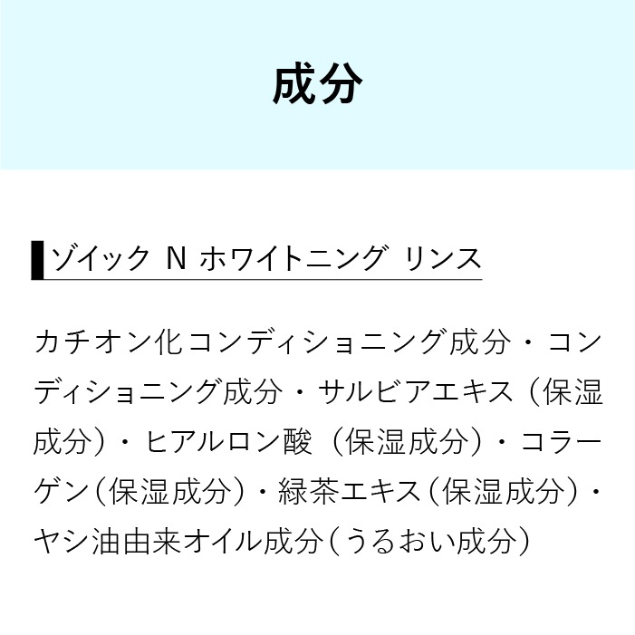 カチオン化コンディショニング成分・コンディショニング成分・サルビアエキス(保湿成分)・ヒアルロン酸(保湿成分)・コラーゲン(保湿成分)・緑茶エキス(保湿成分)・ヤシ油由来オイル成分(うるおい成分)