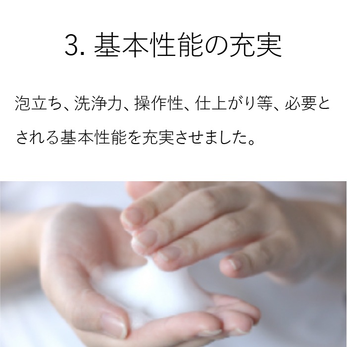 泡立ち、洗浄力、操作性、仕上がり等、必要とされる基本性能を充実させました。