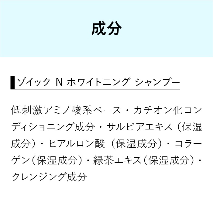 低刺激アミノ酸系ベース・カチオン化コンディショニング成分・サルビアエキス(保湿成分)・ヒアルロン酸(保湿成分)・コラーゲン(保湿成分)・緑茶エキス(保湿成分)・クレンジング成分