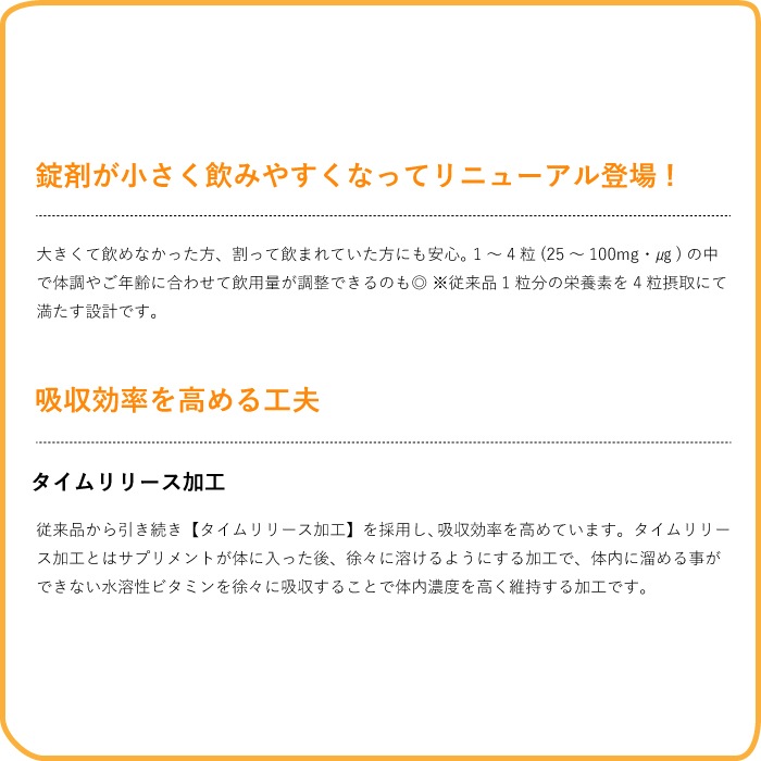 ビタミンB+はタイムリリース加工を施して吸収率を高めております。タイムリリース加工とはサプリメントが体に入った後、徐々に溶けるようにする加工で、水溶性ビタミンの吸収率を高める加工です。