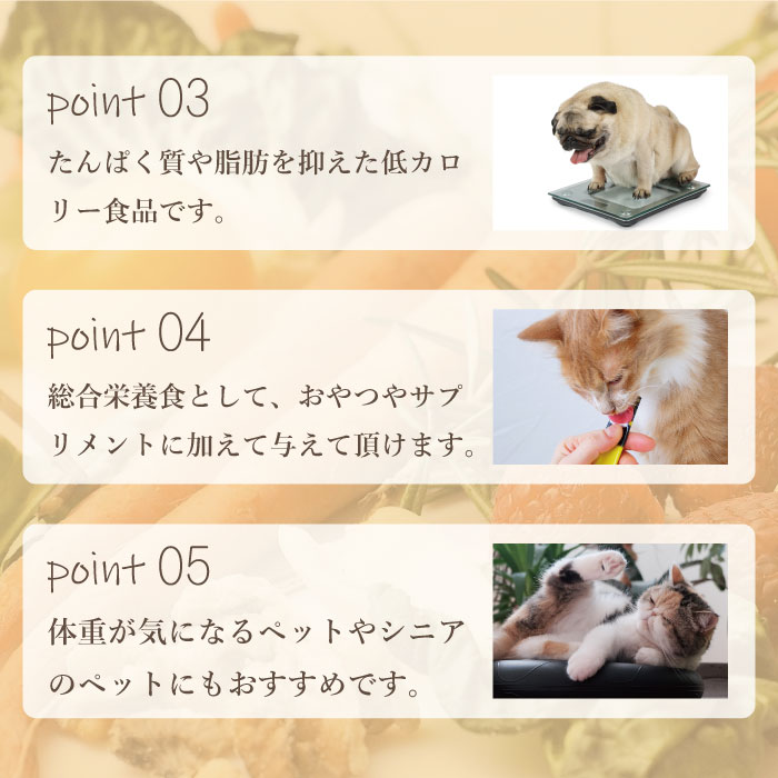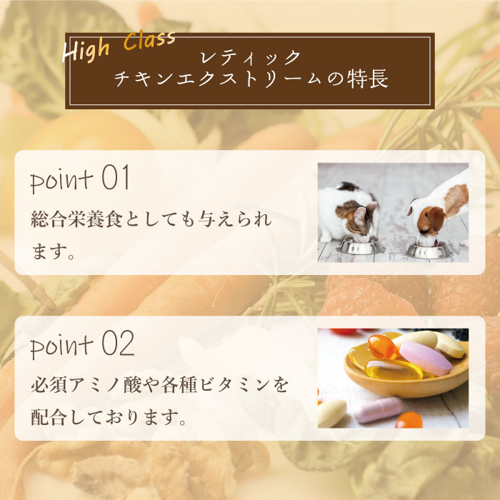 アルカリイオン水を使用し、製品中の水分量を生肉と同程度にすることで、与えやすいウェットフード(総合栄養食)に仕上げました。