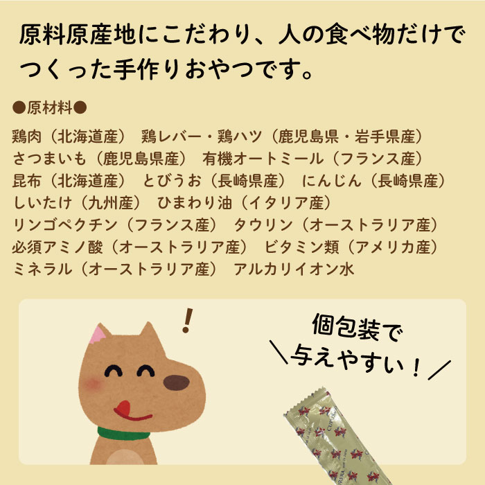 ミミ評価1評価2評価3評価4評価5スティックなので、管理しやすくお出かけにも衛生面で便利です。内容も安心した原材料なので気軽に総合栄養食が食べれるので 愛犬も飼い主も嬉しいです!もっと早く知りたかったです。