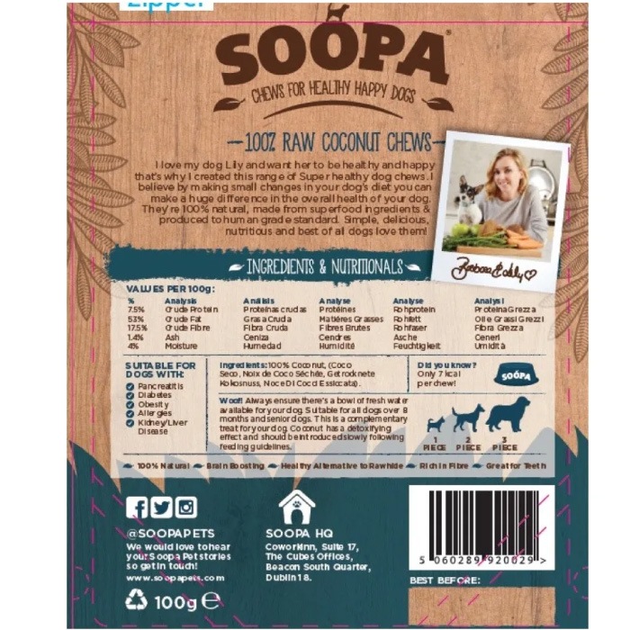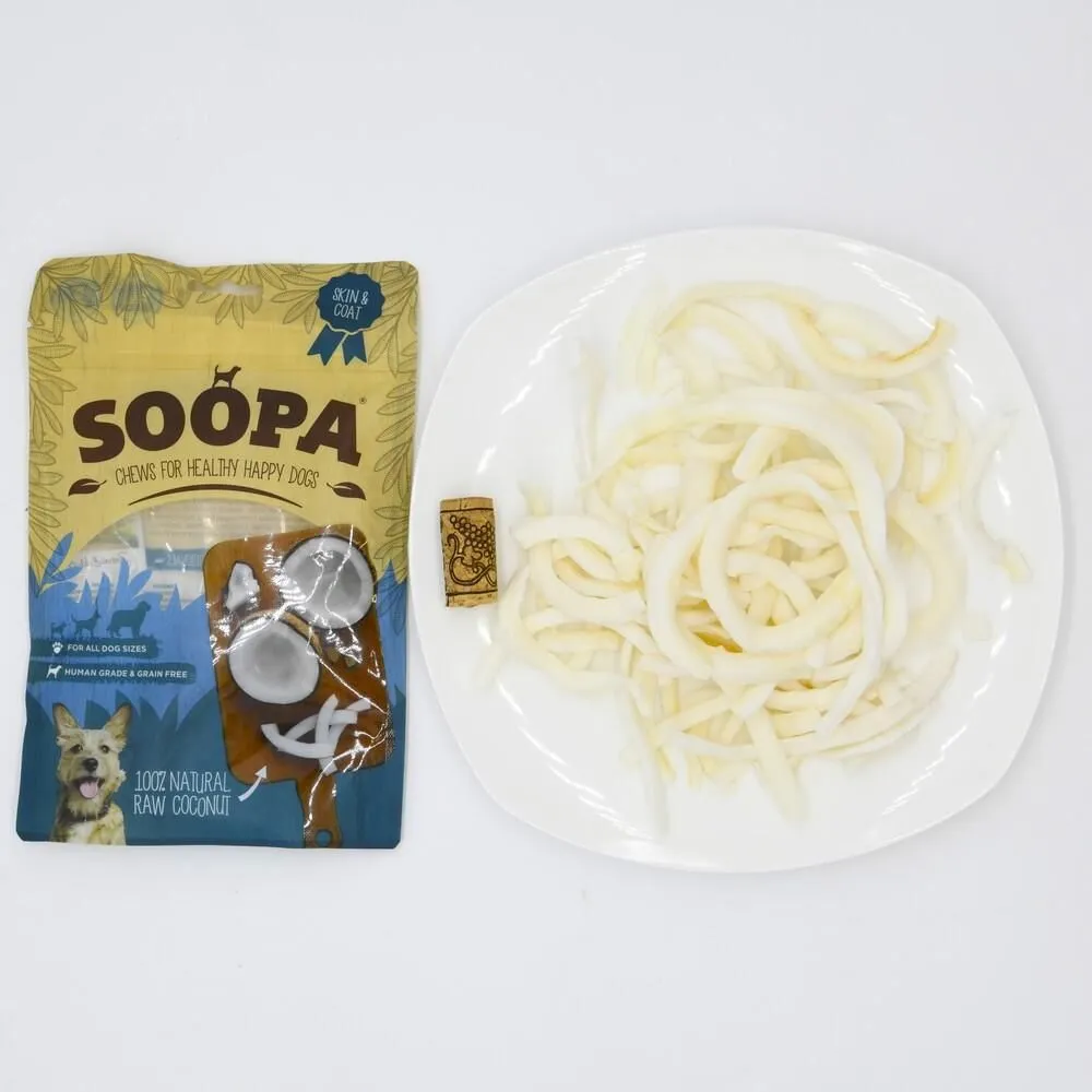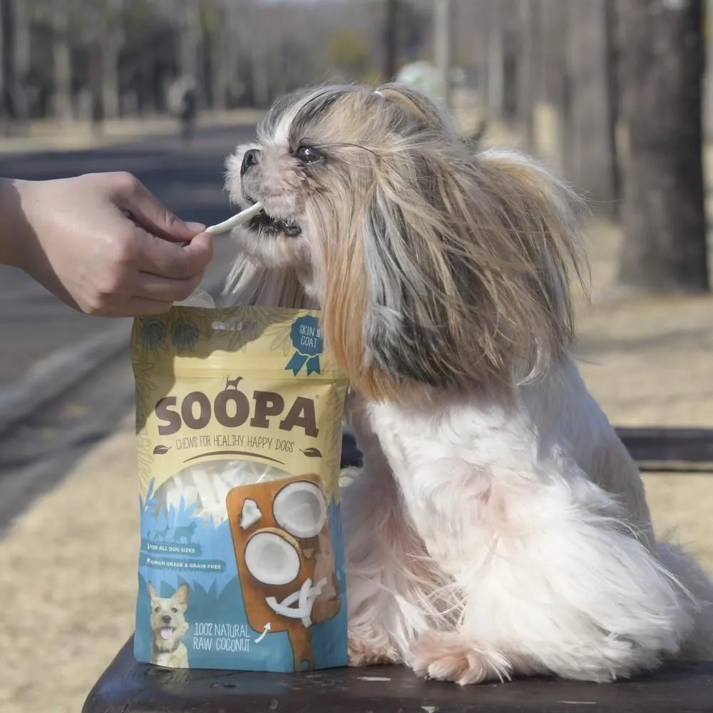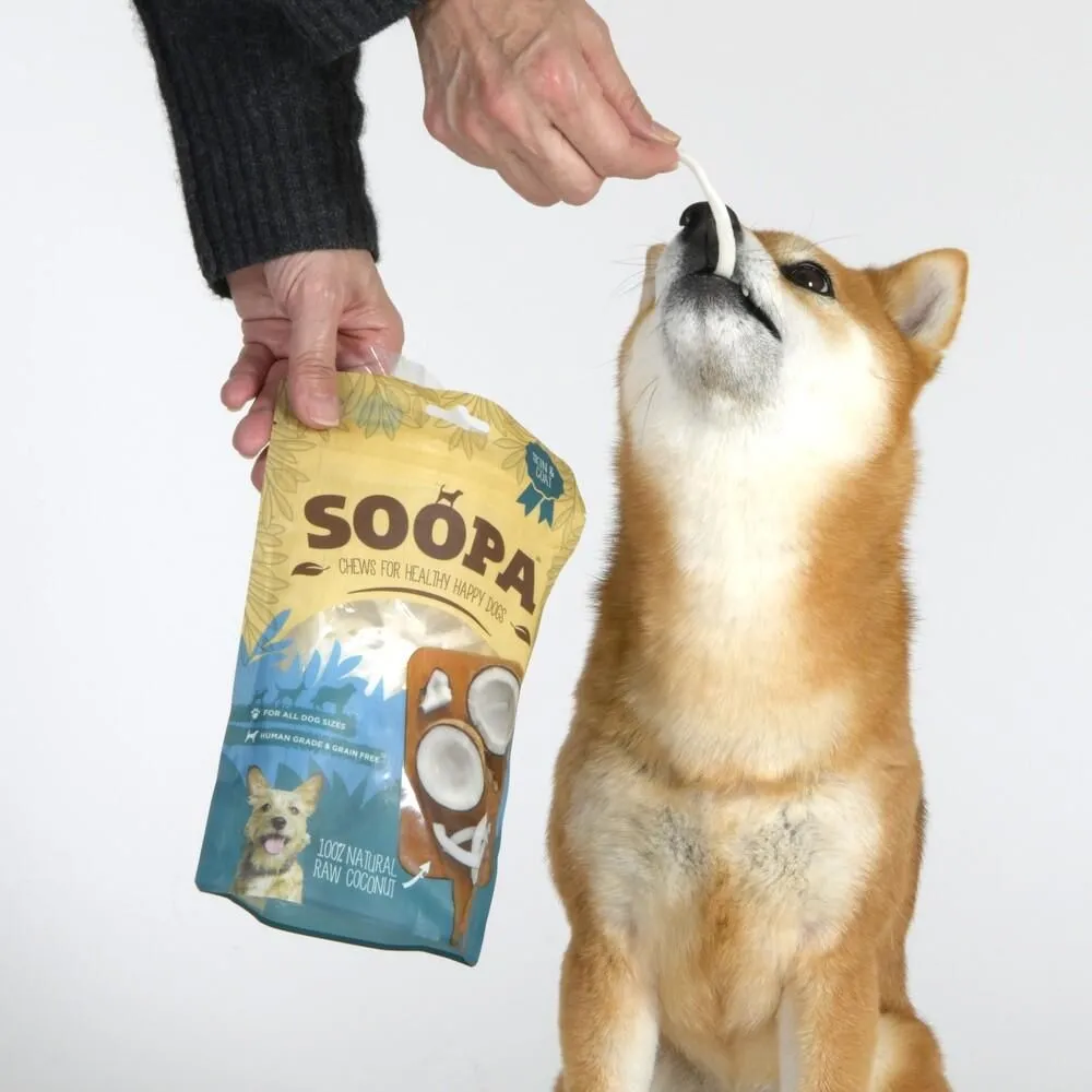『スーパ・ナチュラルココナッツチューズ』は、シンプルでおいしく、栄養価も高い、何よりワンちゃんが大好きな100%プラントベースのスナックです。