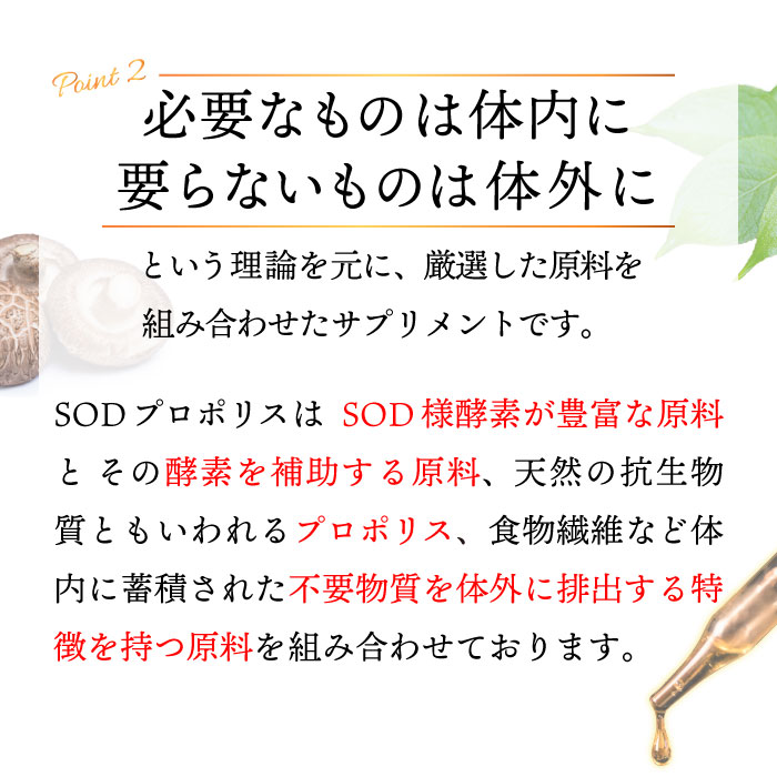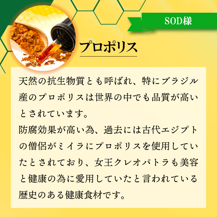 その「SOD様作用食品」を中心に、古代から民間薬としても使用されていた天然の抗生物質ともいわれるプロポリスを配合したものがSODプロポリスです。